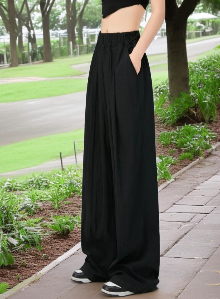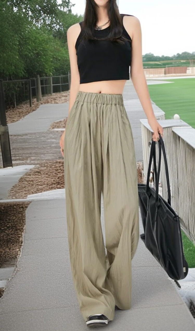 日本製の夏用ハイウエストワイドパンツ。ルーズなドレープデザインで快適。大きいサイズ対応、カジュアルに着こなせるスリム&モップパンツ。