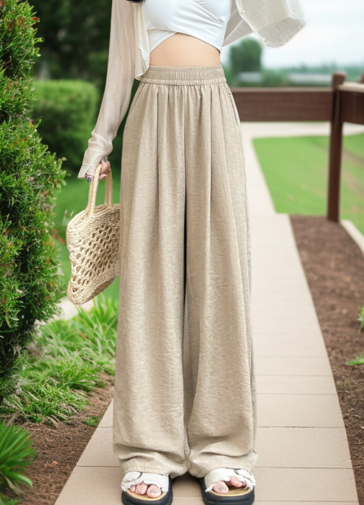 夏用カジュアルワイドレッグパンツ。アイスシルク素材で涼しく快適。ドレープデザインと多用途、テクスチャード加工が特徴。レイジースタイルにも最適。